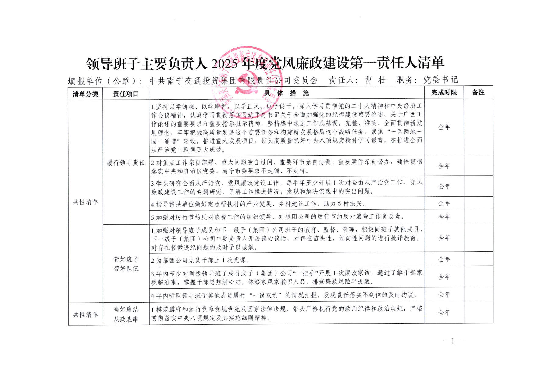 南寧交投集團(tuán)領(lǐng)導(dǎo)班子其他成員2025年度黨風(fēng)廉政建設(shè)“一崗雙責(zé)”清單(一)