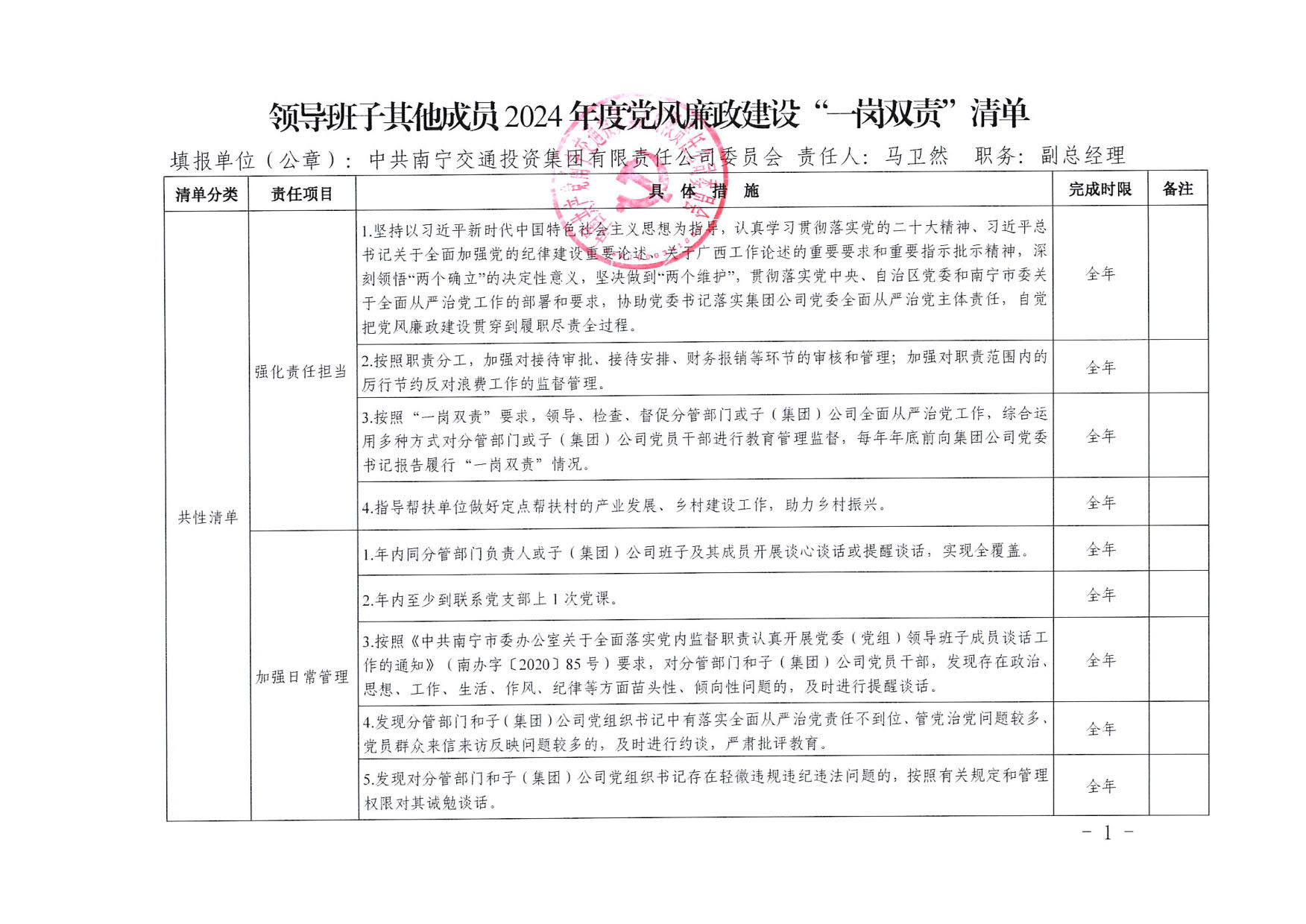 南寧交投集團領(lǐng)導(dǎo)班子其他成員2025年度黨風(fēng)廉政建設(shè)“一崗雙責(zé)”清單(五)